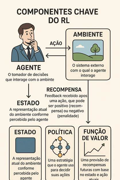 - Recompensa: Feedback recebido após uma ação, que pode ser positivo (recompensa) ou negativo (penalidade).
